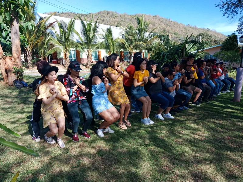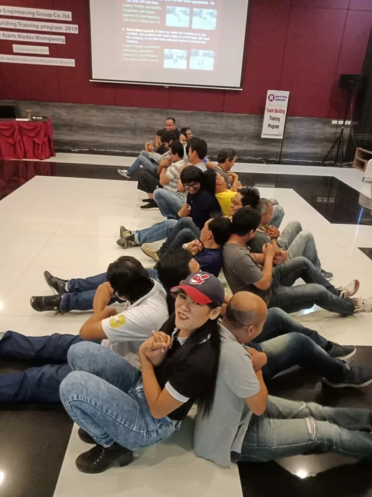 ให้ทุกคนคนยืนเข้าแถวหน้ากระดานเรียงหนึ่ง 2 แถว (คือมีแถวหน้าและแถวหลัง) ให้ทั้ง 2 เอามือกอดอกไว้ แล้วเอาหลังชนกัน ก้าวขาไปข้างหน้า 1 ก้าวยาวๆ โดยที่หลังพิงกันอยู่ แล้วนั่งลงจนถึงพื้นโดยที่เท้าอยู่ที่ตำแหน่งเดิมหัวเข่าจะชันอยู่ แล้วให้ทุกคู่ยืนขึ้นพร้อมกันให้ได้โดยที่หลังพิงกันอยู่