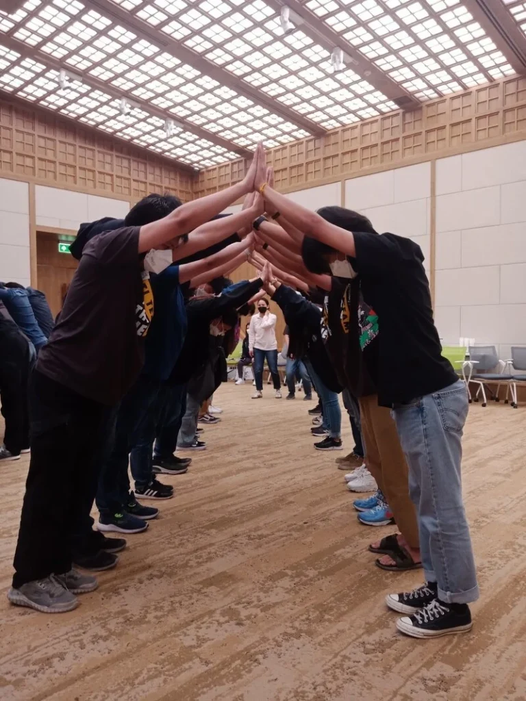 Have everyone to stand in line of two lines by facing each other, then checking the partner hand, make a greeting, then push each partner hands as in the picture. Have each pair step back as much as possible, like the house roof, without any pair falling.