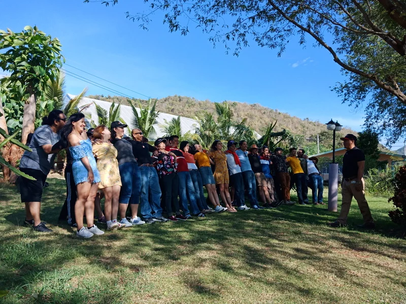 Have 50 (may less or more amount) people stand in line for 2 lines and do team trust fall. This activity provided everybody in the company feel as unity (one team). We all are a part of (Company name) house. It’s mean that everybody is a part of (Company name) we all can be trusted to each other.